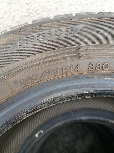Автомобильная шина с маркировкой 185/70R14 88Q. Эта шина предназначена для установки внутренней стороной, обозначенной как «INSIDE». Подходит для использования на различных легковых автомобилях, обеспечивая надежное сцепление с дорогой. Маркировка 88Q указывает на индекс нагрузки и скорости, что важно для безопасности и соответствия требованиям автомобиля.