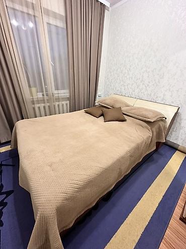 - Двуспальная кровать с изголовьем в светлом бежевом тоне.