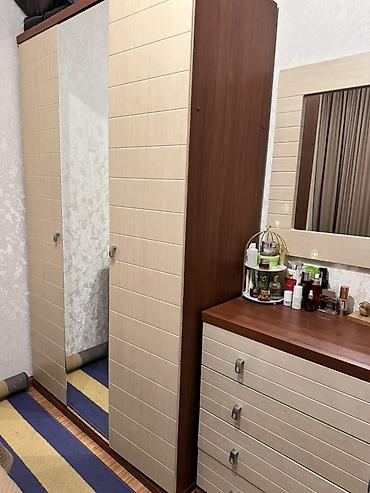 - Трёхдверный шкаф-купе: центральная створка с большим зеркалом во весь рост, боковые — светлые фасады, корпус под орех.