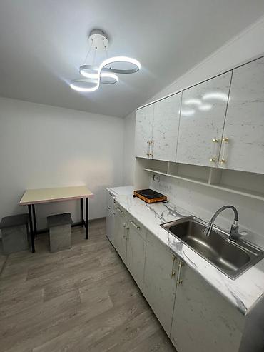 - Кухня: линейный гарнитур под «мрамор» с большой мойкой, стол и две табуретки/пуфа, компактная плита (портативная), рабочая поверхность и закрытые шкафы для хранения, светодиодный дизайнерский потолочный светильник.