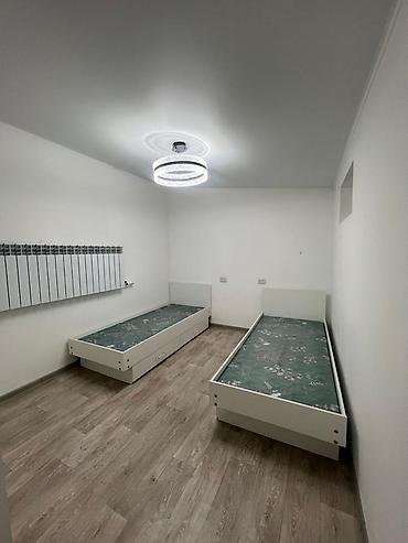 - Спальня: две односпальные кровати с выдвижными ящиками для хранения, большое радиаторное отопление, потолочный светильник с LED-подсветкой.