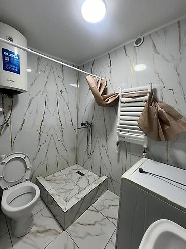 - Санузел: керамическая плитка под «мрамор» на стенах и полу, приподнятая душeвая площадка с линейным трапом, душевой гарнитур, унитаз, место под штору на круговой штанге, раковина.