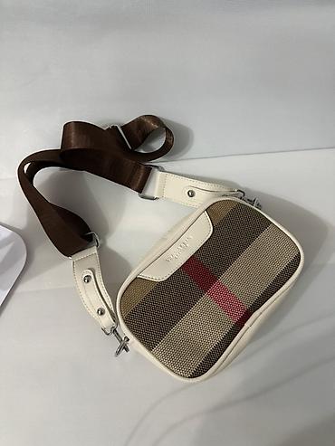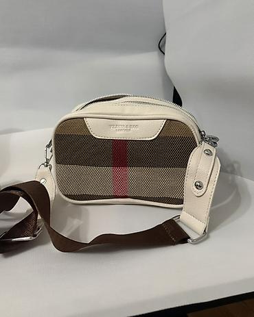 - Материалы: плотная текстильная ткань с фирменным клетчатым рисунком; накладки, окантовка и крепления ремня выполнены из светлой (молочной) экокожи/кожи; металлическая фурнитура серебристого цвета.