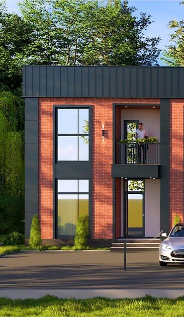 - Фасад: клинкер, панорамные окна.