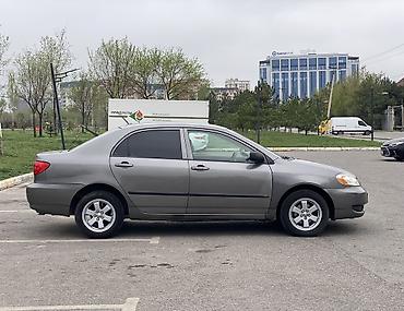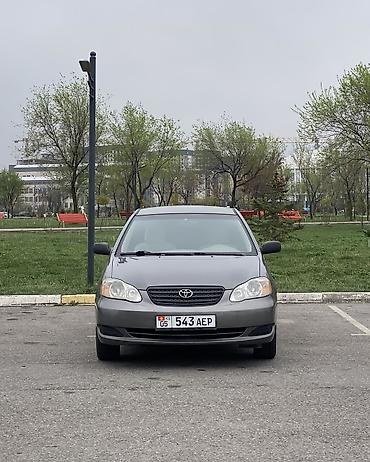 Toyota Corolla седан, серебристый цвет, кузов E120. Номерные знаки KG. Ключевые особенности: - Бензиновый двигатель (рядный 4-цилиндровый), передний привод. - МКПП. - Литые диски, шины легкового к...