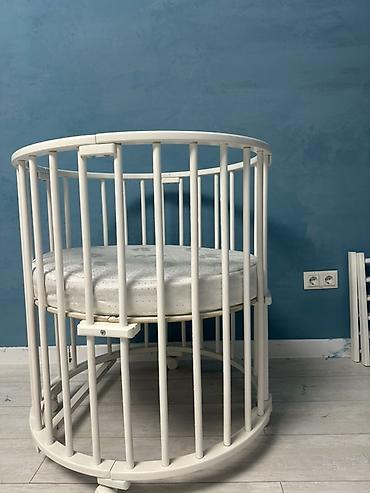 - Комплектация на фото: каркас кроватки, матрас круглый/овальный, мягкие подушки-аксессуары (как на первом фото).