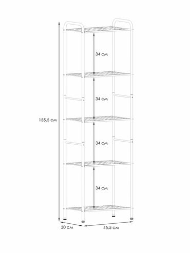 Система хранения имеет 5 металлических сетчатых полок, каждая из которых выдерживает нагрузку до 8 кг.