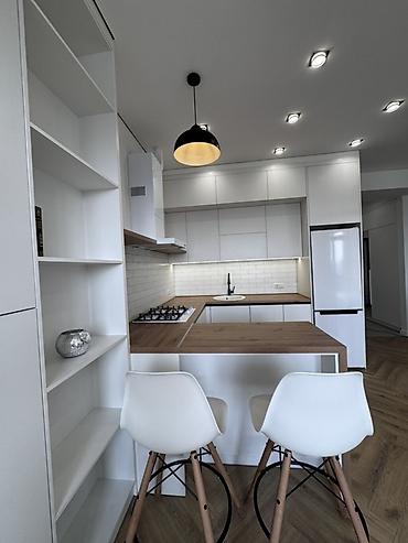- белыми глянцевыми кухнями, деревянными столешницами и барной стойкой;