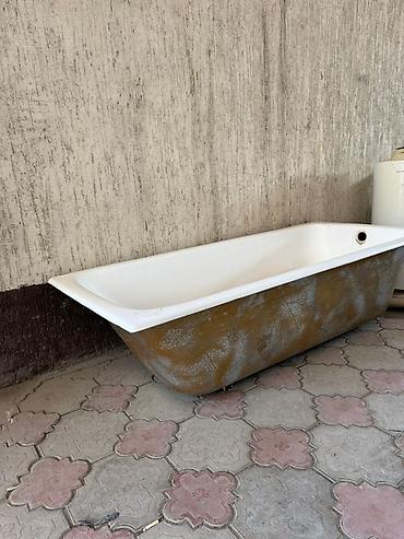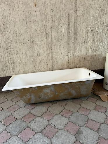 - Ванна прямоугольная, классическая форма. Материал — эмалированная чаша (судя по виду — сталь/чугун с эмалью), наружная поверхность без облицовки. Отверстия под слив/перелив выполнены, борта широкие и ровные. Подходит для встраивания в нишу или установки на ножки/каркас. Хороший вариант для дачи, мастерской или ремонта.