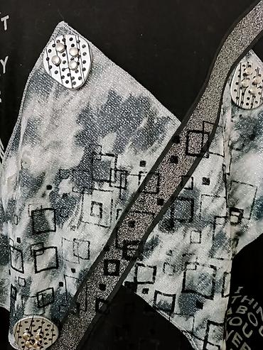 Идеальна для повседневных образов и кэжуал-луков, хорошо сочетается с джинсами, легинсами и узкими брюками. Стиль — арт/урбан, акцент на графике и блеске.