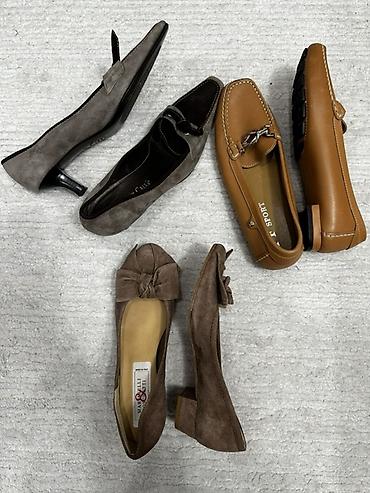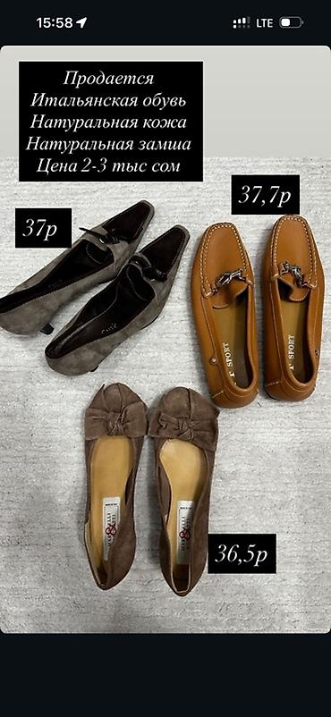 Женская обувь 1) Лоферы/балетки - Цвет: черный - Материал: перфорированный верх (дышащий) - Низкий каблук/подошва - Декор: металлические люверсы по бокам - Размер: 38 - Цена: 500 сом 2) Туфли на ...