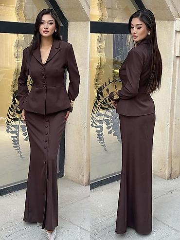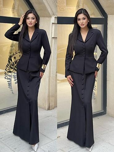 - Состав комплекта: приталенный жакет + длинная расклешённая юбка.