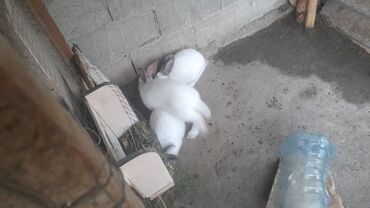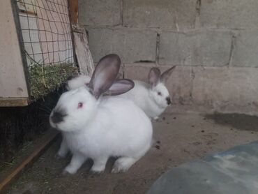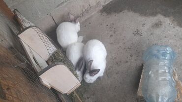 Кролики САМЦЫ белые с темными ушами и метками на носу, помесь Калефорнийца и белого гиганта.На фото — молодые особи 5 месячные в вольере, с кормушкой-сенником. ЕСТЬ 1 САМКА 5 МЕСЯЧНАЯ.
