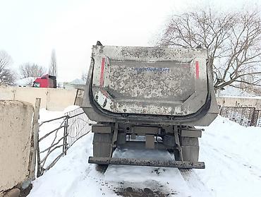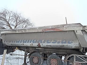 Отличается прочной рамой, надежной гидравликой и большим объемом кузова — подходит для строительных и дорожных работ. Маркировка на бортах: Schmitz; надписи на кузове на немецком языке.