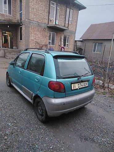 Daewoo Matiz, хэтчбек 5 дверей, бирюзовый цвет с серебристыми бамперами. Компактный городской автомобиль на киргизских номерах (01 KG, 174 AEP).