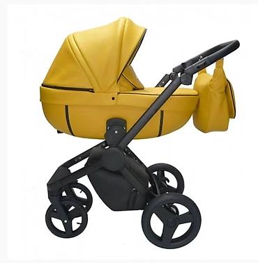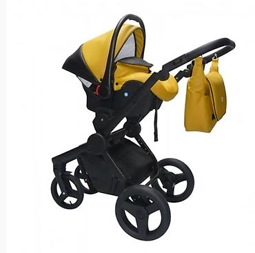 Детская коляска трансформер 3-в-1, цвет горчично-жёлтый с чёрными элементами.
