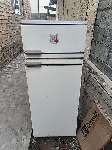 Холодильник двухкамерный, классический белый цвет. Верхняя камера — морозильник с отдельной дверцей, нижняя — холодильное отделение с механической регулировкой температуры. Внутри: три металлические полки-решётки, нижний отсек для хранения, на двери — полки и лотки для мелких продуктов/бутылок. Ручки горизонтальные, металлические. Компактный корпус — удобен для кухни, дачи, мастерской или как дополнительный холодильник. Простая конструкция без электроники, доступ к испарителю сверху. На фасаде — декоративная наклейка.