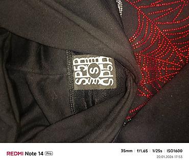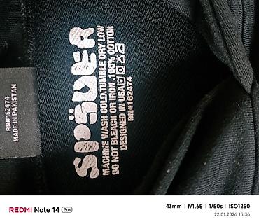 - Дизайн: крупная вышивка/аппликация красной паутины на груди, блестящая надпись “spider” сверху