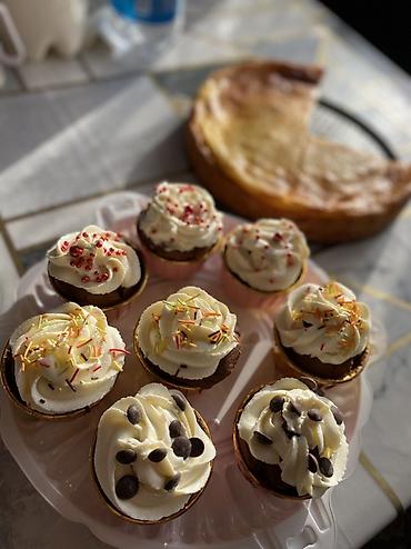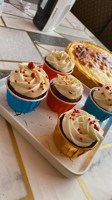 - Пышные шоколадные бисквитные капкейки с кремом на основе сливочного сыра/сливок.