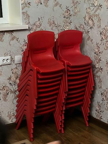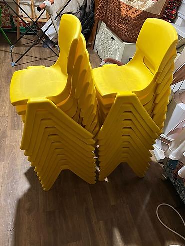 - Стулья: пластиковые, легкие, прочные, штабелируются. Спинка с эргономичным изгибом и хватом-ручкой для переноски. Два цвета: ярко‑желтый и красный. Устойчивые ножки, закругленные края, подходят для детских садов, игровых комнат, кружков и домашних детских зон. Компактное хранение за счет вертикальной укладки стопками.