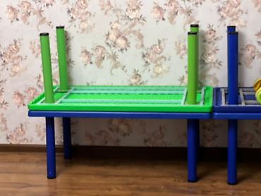 - Столы: прямоугольные, модульные. Столешница из пластика, устойчивого к влаге и легкого в уходе; поверхности легко моются. Ножки цилиндрические, съемные/на резьбе (на фото столы в перевернутом виде для демонстрации креплений), цвета — зеленый и синий. Можно комбинировать несколько столов в один ряд для групповых занятий.