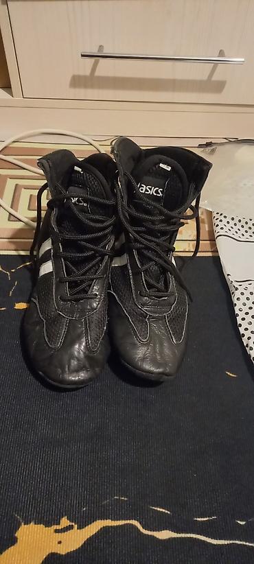 - Борцовки Asics черного цвета с шнуровкой, высоким голенищем и вентиляционными вставками из сетки.