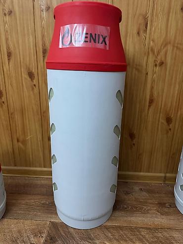 - Современные композитные баллоны для пропан-бутана с красной защитной «горловиной» и белым корпусом с смотровыми окнами для контроля уровня.