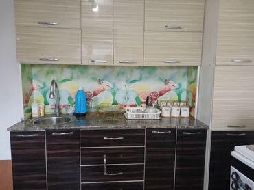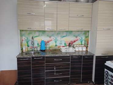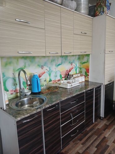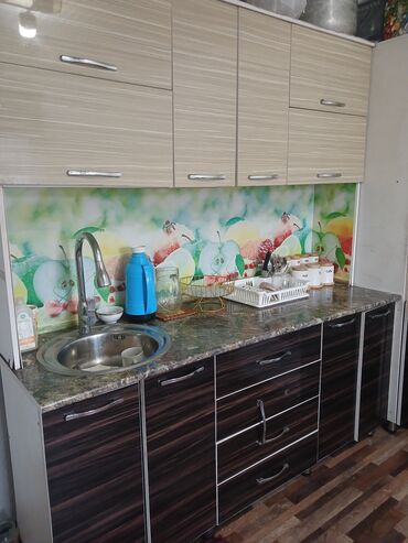 цена без мойка 12000 с мойкой 13500 доставка по городу бишкек 500 Кухонный гарнитур с серыми фасадами, имитирующими бетонную поверхность, и столешницей с рисунком под белый мрамор. Верхние шкафы с ...