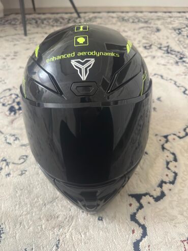 Мотошлем FGN с визором - Тип: полноразмерный (интегральный) шлем с козырьком - Брендинг: FGN на визоре и корпусе - Цвет и дизайн: черный с неоново‑желтыми акцентами и голубыми графическими элемент...
