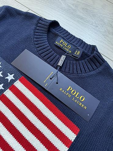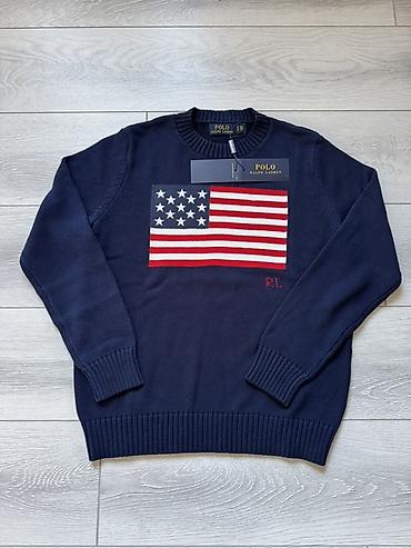 - Дизайн: крупный вязаный мотив флага США на груди; вышитые инициалы “RL” красного цвета ниже рисунка