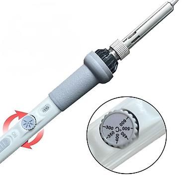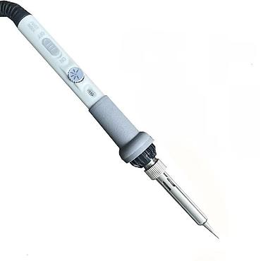 - Электрический паяльник с регулировкой температуры (поворотный регулятор на рукоятке, диапазон 200–500 °C, индикатор питания, кнопка ON/OFF).