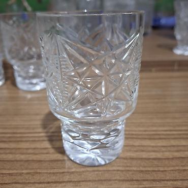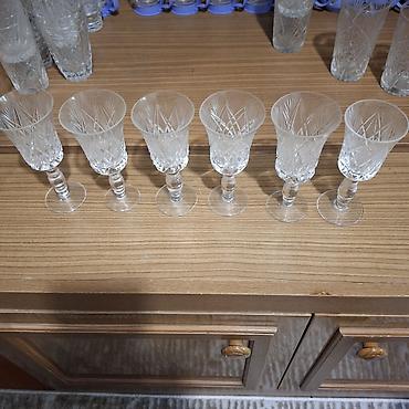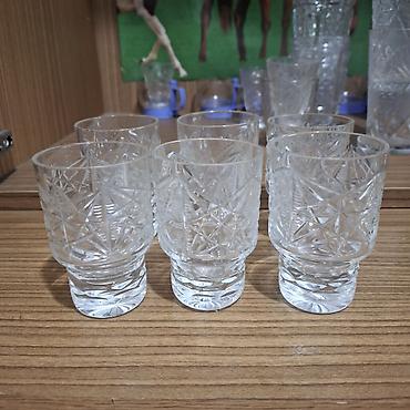 - 6 бокалов на ножке для ликёра/десертного вина. Тонкий расклёшенный верх, гранёная чаша с пересекающимися лучами и ромбами, фигурная ножка, круглая устойчивая ножка-основание.