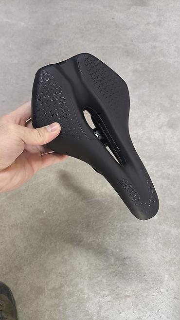 - Седло: эргономичная форма с вентиляционным/разгрузочным вырезом по центру для снижения давления; противоскользящая фактура покрытия; усиленные металлические рамки стандартного Ø7 мм совместимы с большинством хомутов.