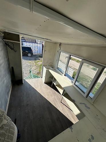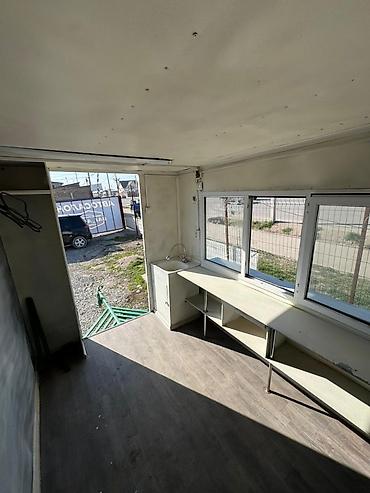 - Торговое окно с раздвижными пластиковыми рамами и выносной полкой; сверху — откидной металлический козырек.