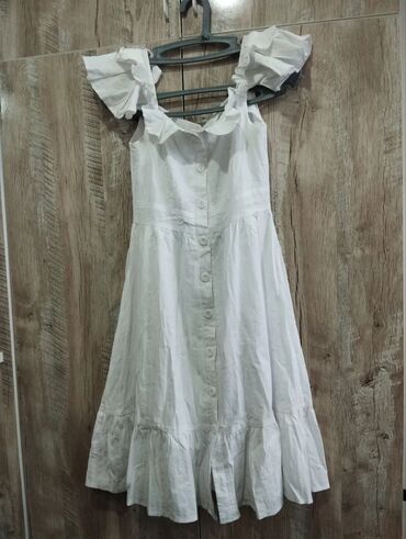 - Детали: застёжка на пуговицы по всей длине, свободный А‑силуэт с воланом по низу, пышные плечики/рукава‑рюши