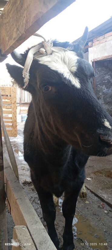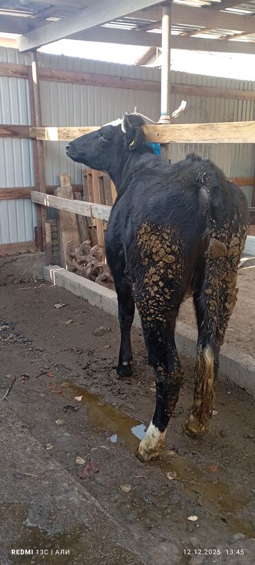 Телека (молодняк), черно-пестрой масти, с рогами. На ушах бирка. Держится на привязи, спокойно реагирует на человека и транспорт. Телосложение крепкое, ровная спина, выраженная мускулатура, прямые ...