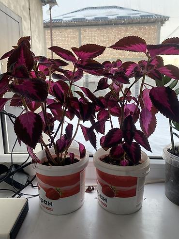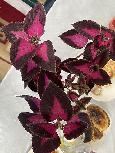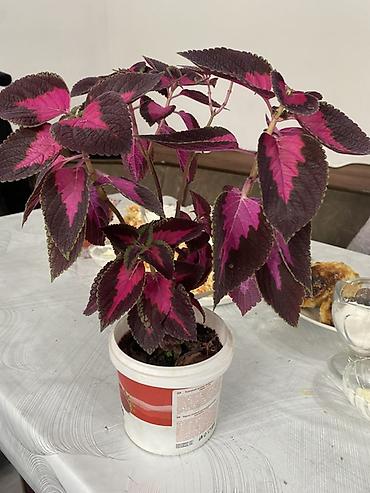 Колеус (декоративная крапива) с яркой розово-бордовой листвой.