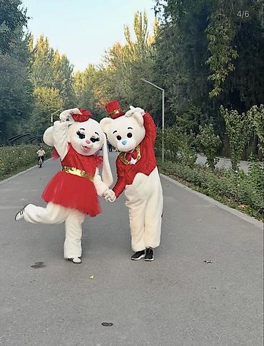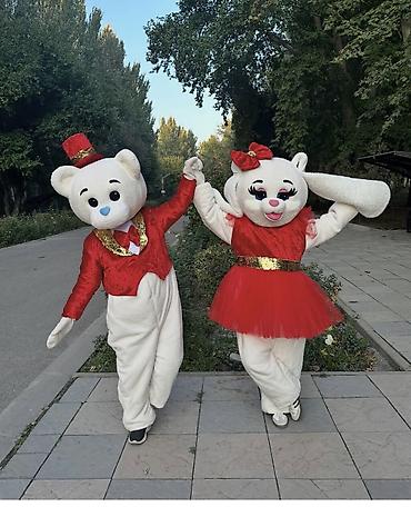 - Пара ярких персонажей в белых плюшевых костюмах: медвежонок в красном фраке с золотым декором и цилиндром, и медведица в красном платье-пачке с золотым поясом и бантом.