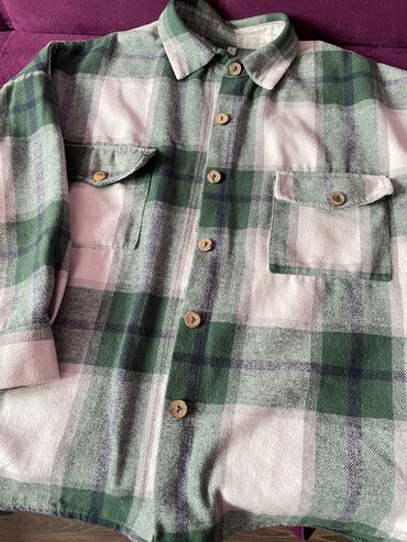 Женская зелёная рубашка из плотной ткани с карманами на груди и по бокам, выглядит как пиджак немного. Размер 46.