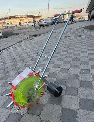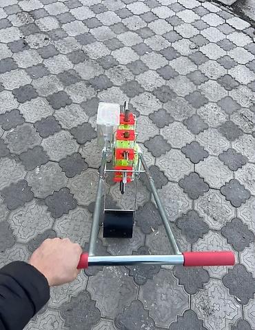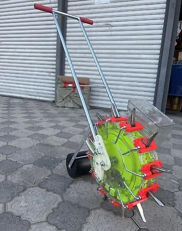 - Комплектация: сеялка в сборе с дозирующим колесом, сошниками/ложечками, бункером для семян, прикатывающим катком, ручкой.