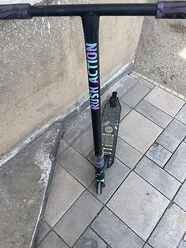 - Дека из алюминия с графикой и шкуркой (гриптейп) Rush Action; прямоугольный профиль с вырезом под рулевую, задний пластиковый тормоз-спойлер.