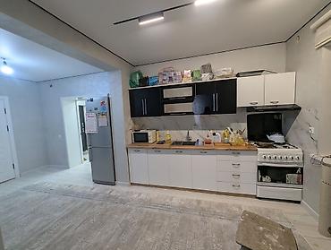 - Общая просторная кухня: длинная рабочая поверхность, мойка, газовая плита с духовкой, вытяжка, холодильник, микроволновка и навесные шкафы для хранения.