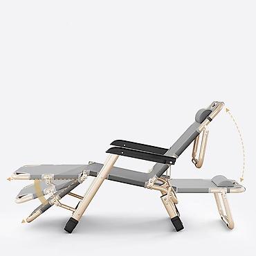 Раскладное шезлонг‑кресло с подголовником - Тип: шезлонг/кресло‑лежак - Конструкция: складная, на металлическом каркасе - Материал сиденья и подножки: дышащая ткань светлого цвета - Спинка: удлине...