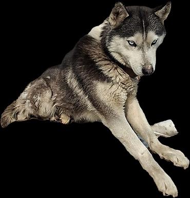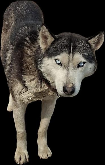 Сибирская хаски с эффектными голубыми глазами. Классический окрас “черный с серебром/кремом”, плотный двойной подшерсток, стоячие уши, выразительная маска на морде. Собака среднего размера, крепкого телосложения, на ошейнике. Подходит для активных владельцев: любит движение, прогулки и игры, хорошо переносит холод благодаря густой шерсти. Требует регулярного вычесывания в период линьки и умственной нагрузки (дрессировка, задачи на сообразительность). Дружелюбный, коммуникабельный характер, высокая выносливость и ориентированность на человека.