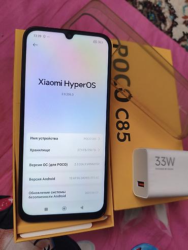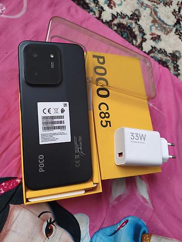 - Комплектация по фото: смартфон POCO C85, фирменная коробка, силиконовый чехол‑бампер, зарядное устройство 33W, документация/лоток внутри коробки.