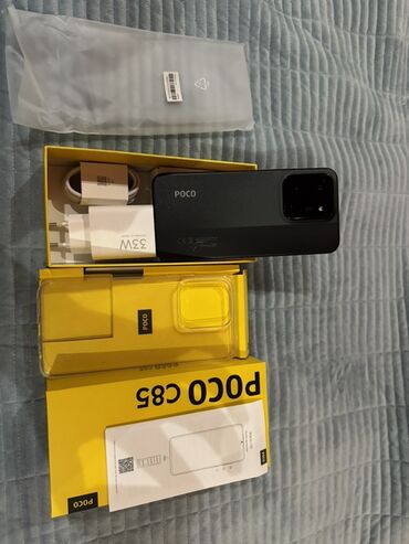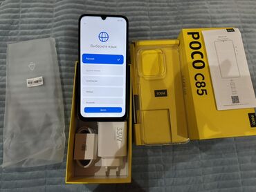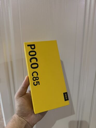 POCO C85 — смартфон в фирменной жёлтой коробке.