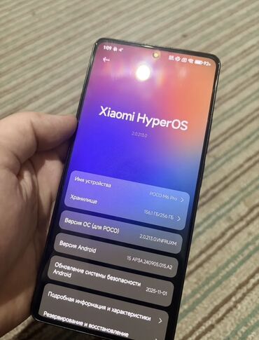 POCO M6 Pro, версия с 256 ГБ встроенной памяти (доступно ~156 ГБ). Работает на Xiaomi HyperOS 2.0.213.0 (для POCO) на базе Android 15. Патч безопасности Android: 2025‑11‑01.