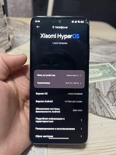 Xiaomi Redmi Note 11, версия памяти 6/128 ГБ (доступно ~56,7 ГБ). Установлена Xiaomi HyperOS 1.0.8.0 (Android 13, патч безопасности 2024-10-01). ...