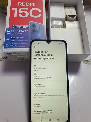 Смартфон Xiaomi Redmi 15C в черном цвете. Модель оснащена 16 ГБ оперативной памяти и 256 ГБ встроенной памяти, что обеспечивает достаточно места для приложений и файлов. Устройство имеет большой дисплей размером 6.9 дюйма с частотой обновления 120 Гц для плавного изображения. Аккумулятор емкостью 6000 мАч поддерживает быструю зарядку мощностью 33 Вт. Смартфон работает под управлением операционной системы Xiaomi HyperOS на базе Android.