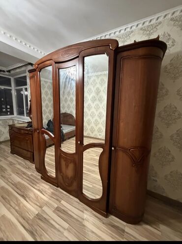 - Шкаф многостворчатый с центральными зеркалами. Боковые закруглённые секции, декоративные филёнки, ручки‑капли. Внутри — секции для хранения (платяная зона с перекладиной, полки; распределение по отделениям).